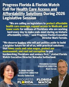 “We are calling on legislators to protect affordable health care coverage, expand access to Medicaid, and lower costs for millions of Floridians who are working hard every day to make ends meet during an historic affordability crisis,” said Progress Florida Executive Director Mark Ferrulo. “We need our elected representatives to be laser-focused on an affordability agenda with practical solutions for working families and seniors that lower costs, raise wages, and expand access to health care.”